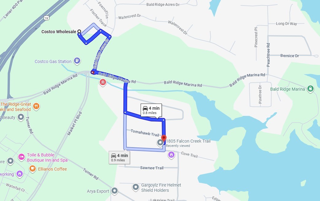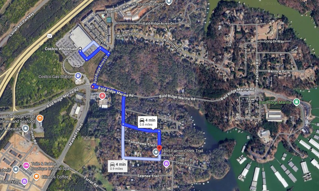 From the Costco, go down Bald Ridge Acres Dr, take a left on Bald Ridge Marina Rd, then a right at Eagle Creek Trail. Go about 0.3 miles on Eagle Creek, then a left on Falcon Creek. Take a left onto Lakeside Trail and the property is just on the left.