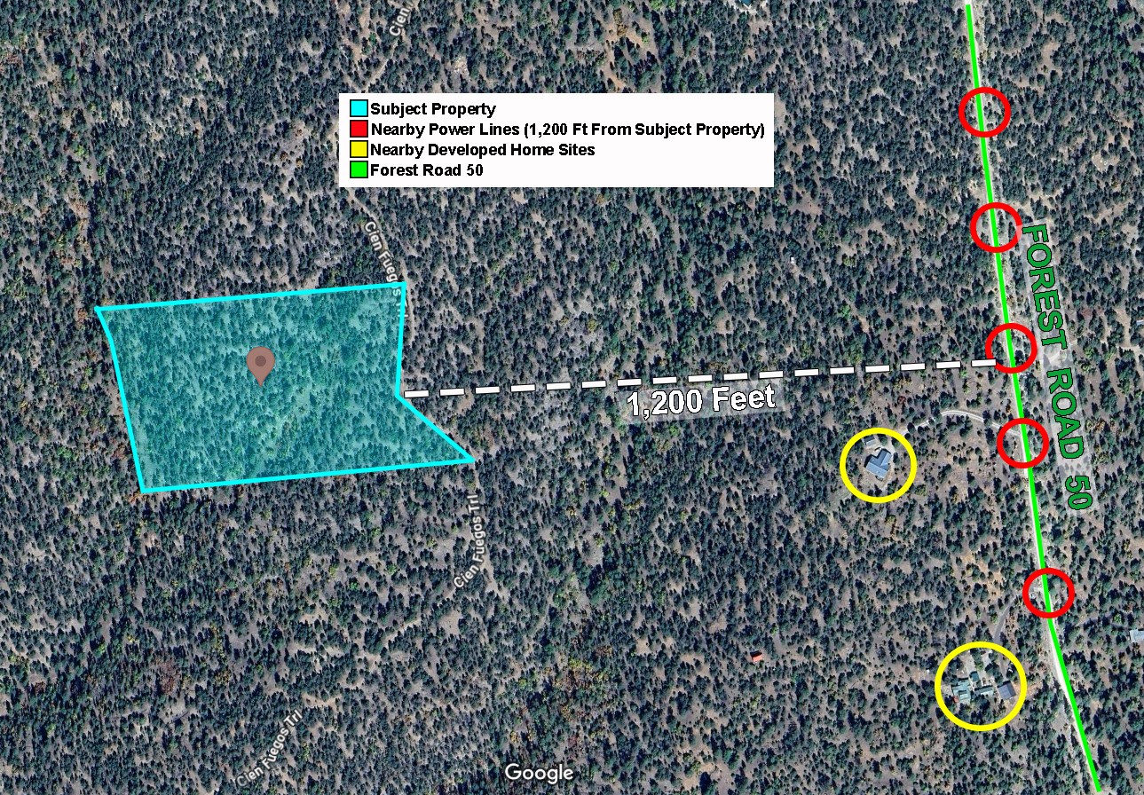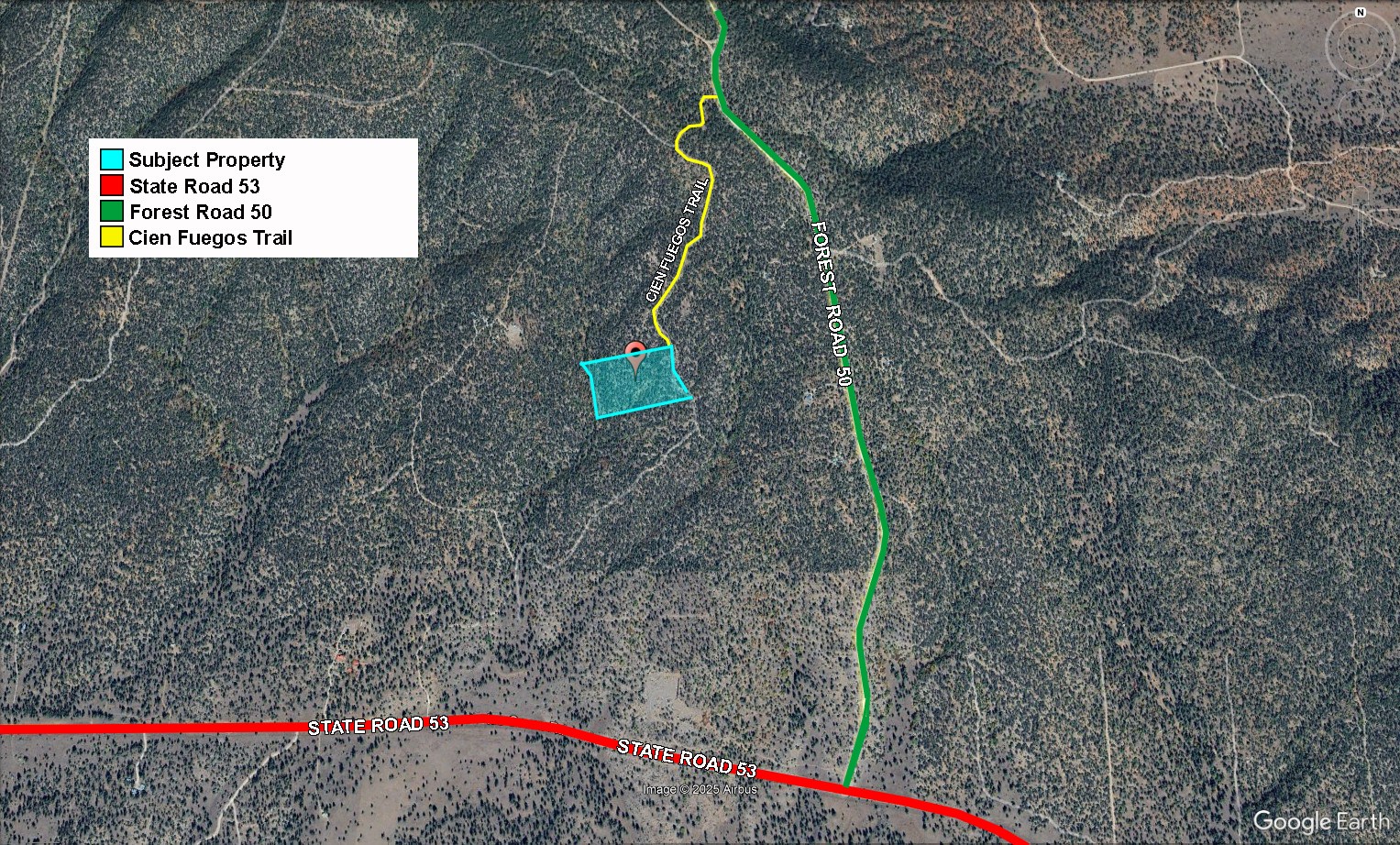 Roads & Access, Cont'd: When accessing the subject property, one can either take Cien Fuegos Trail from State Road 53 and approach from the south or take Cien Fuegos Trail from a turn-off along Forest Road 50 and approach from the north. While our photographer recommends the route which branches off the Forest Road, both paths have been photographed and presented with accompanying maps in the photo gallery at the bottom of this listing page.