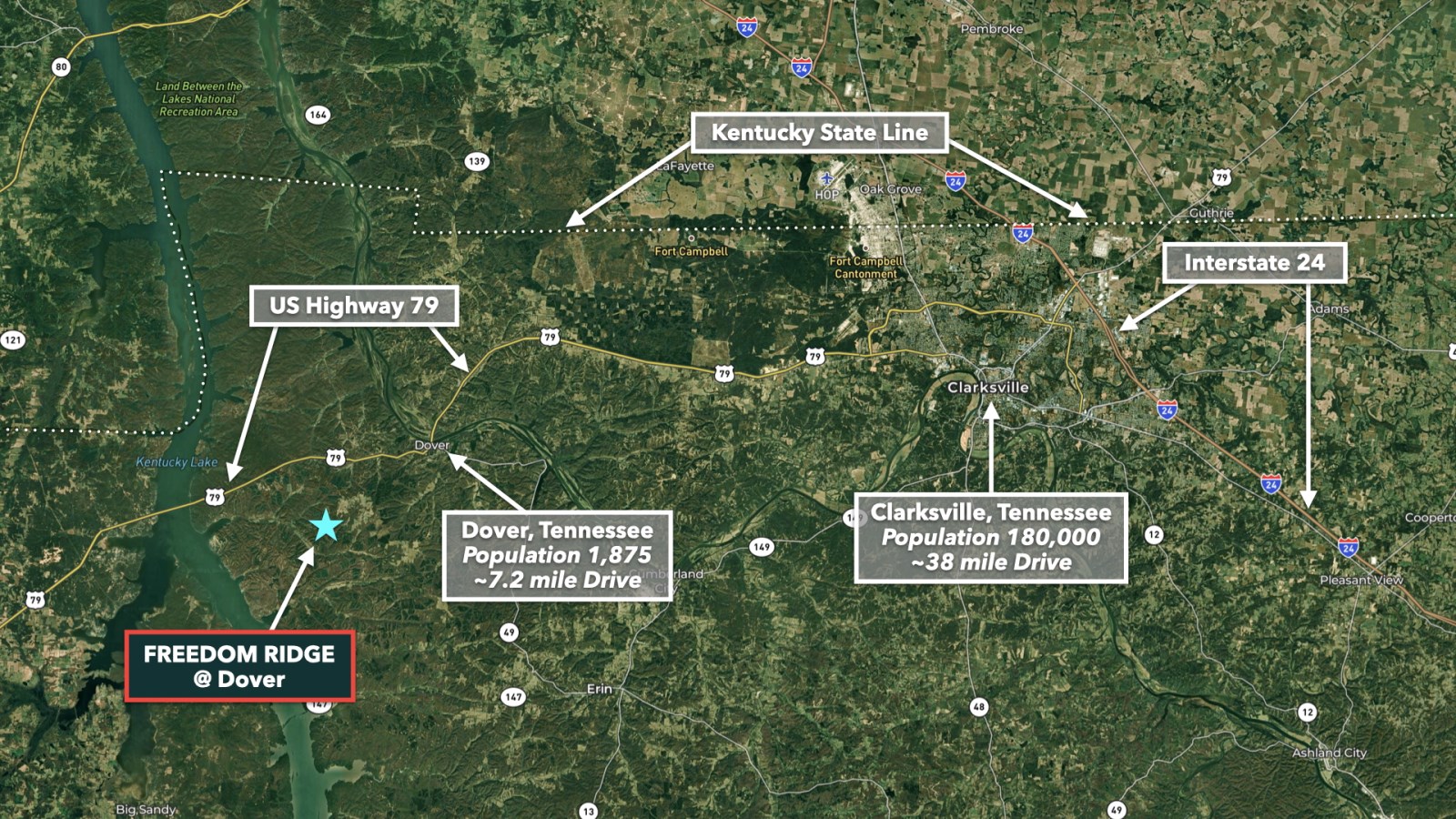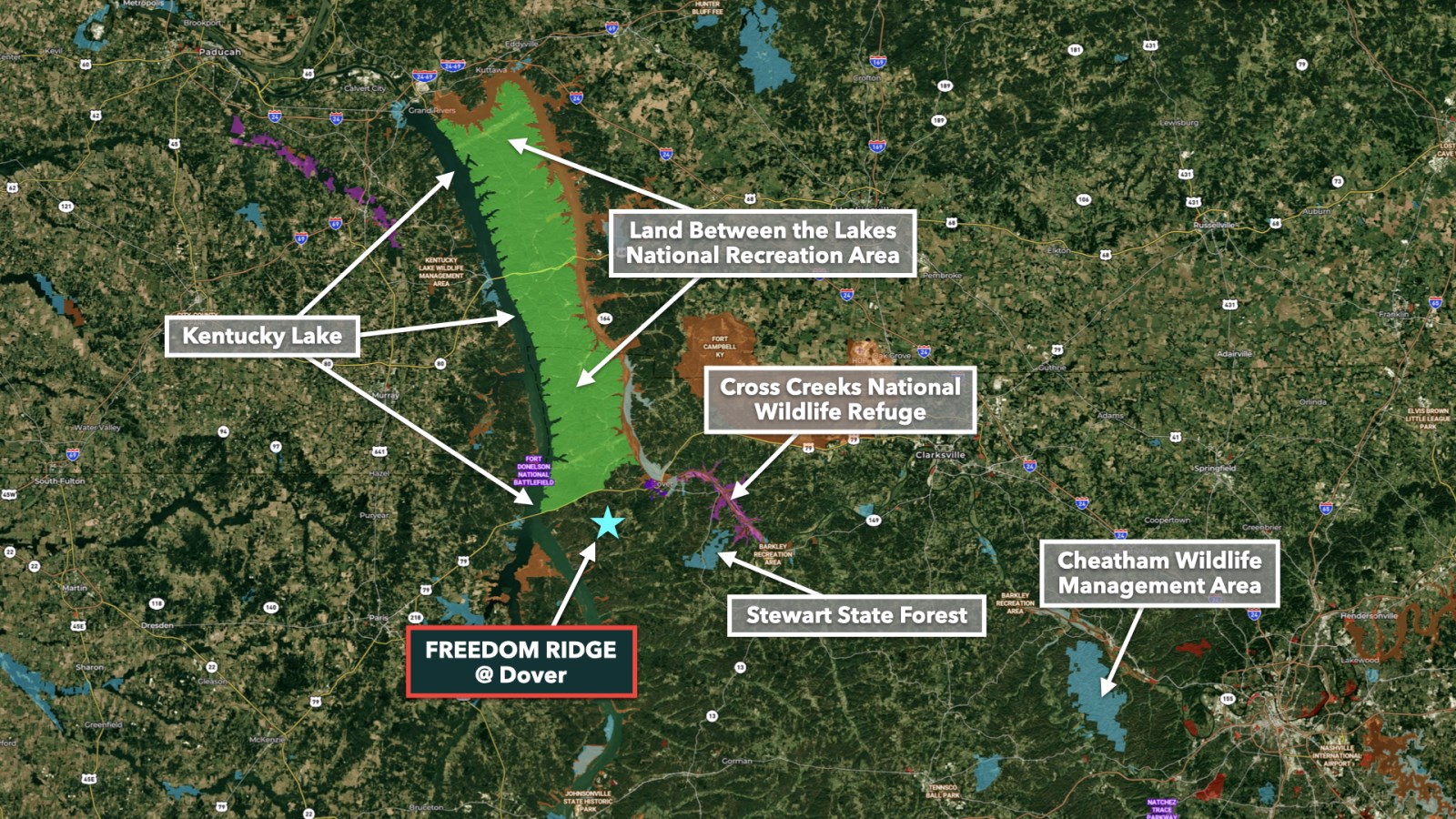 Freedom Ridge Dover is ideally situated between Kentucky Lake and Lake Barkley, while also being less than 3 miles from the South boundary of the 170,000 Acre Land Between the Lakes National Recreation Area.