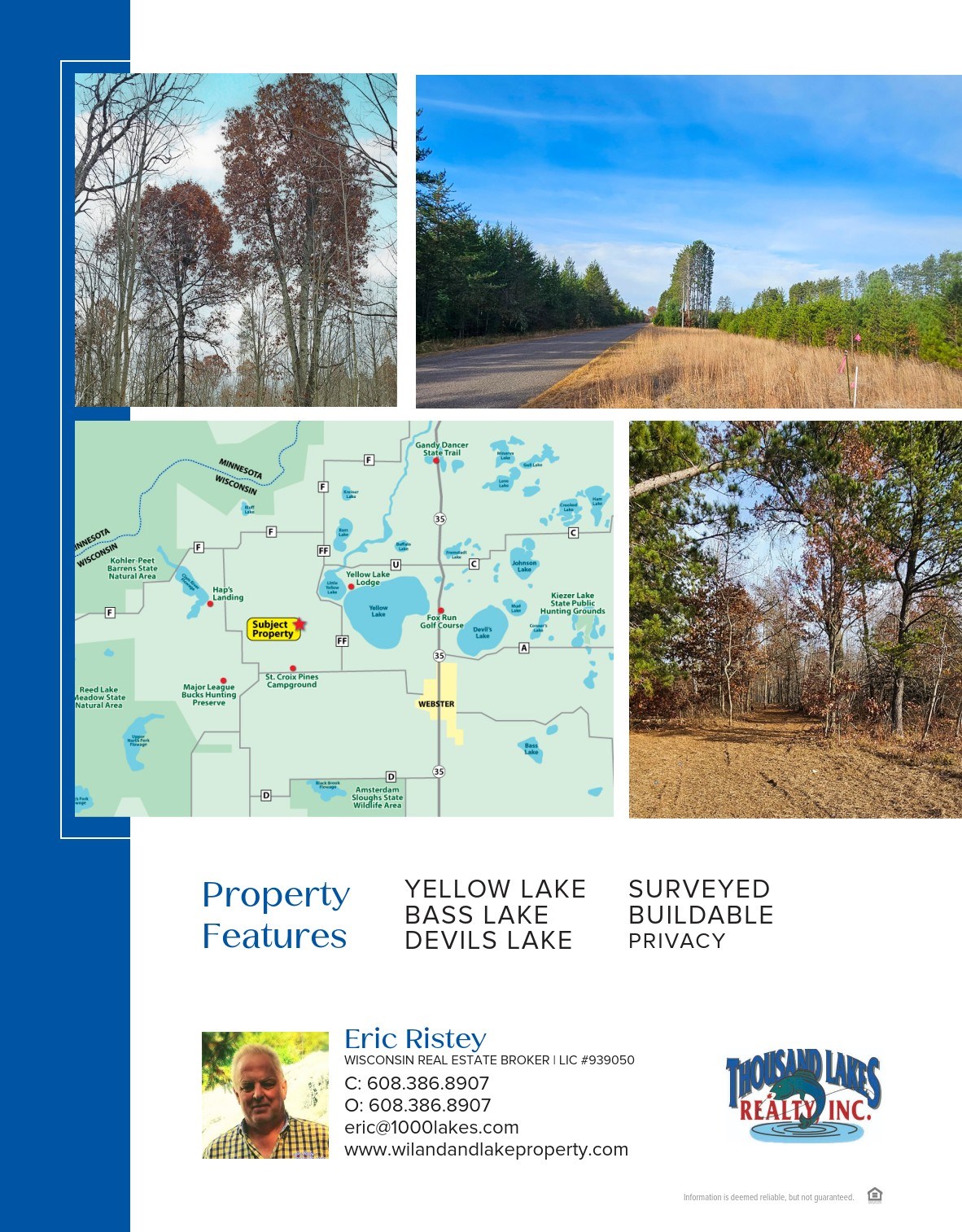 From Webster turn onto Hickory Street W./ County Hwy Ff approximately 3.5 miles, turn left onto Perisa Road turn right onto Lee Road then turn left onto Welch Road Look for the signage from Thousand Lakes Realty