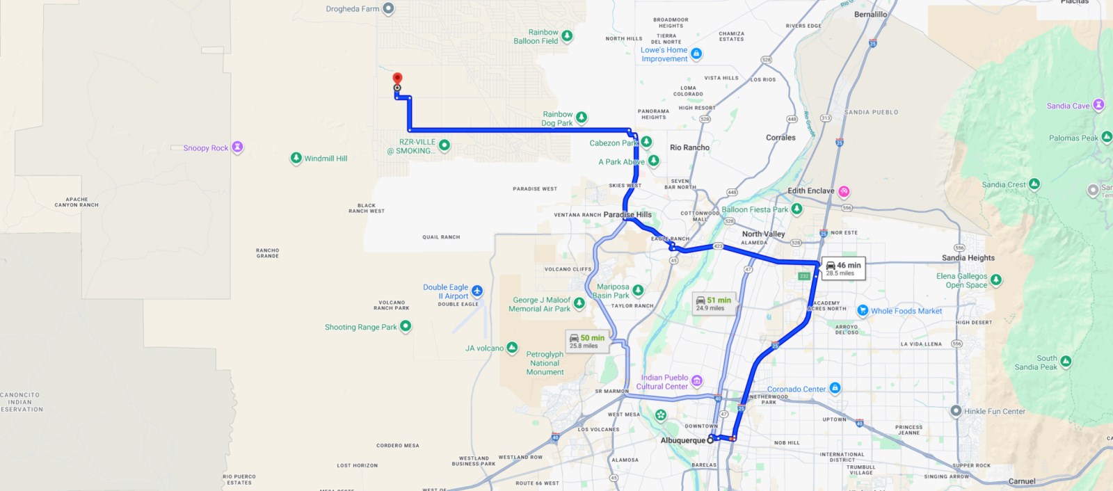 Drive from I-25 N, NM-423 W/Paseo Del Norte Blvd NE, Paradise Blvd NW and Unser Blvd NW to Rio Rancho