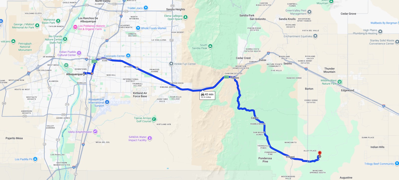 Follow NM-222 and Manzano Springs Rd/Navajo Trail to Zia Rd in Manzano Springs