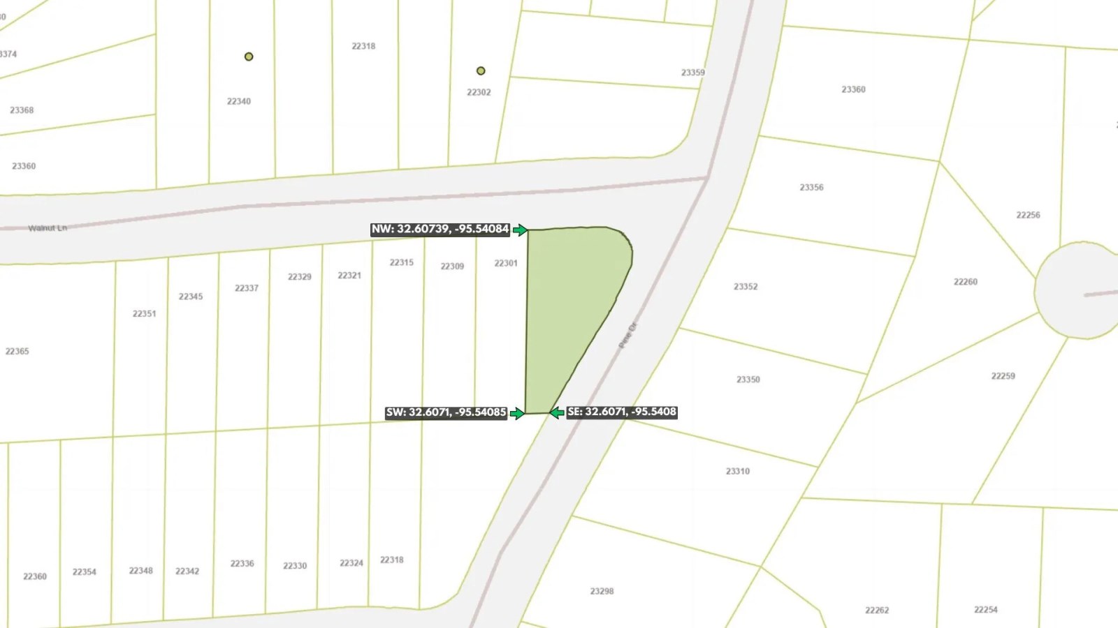 Southwest Corner: 32.6071, -95.54085