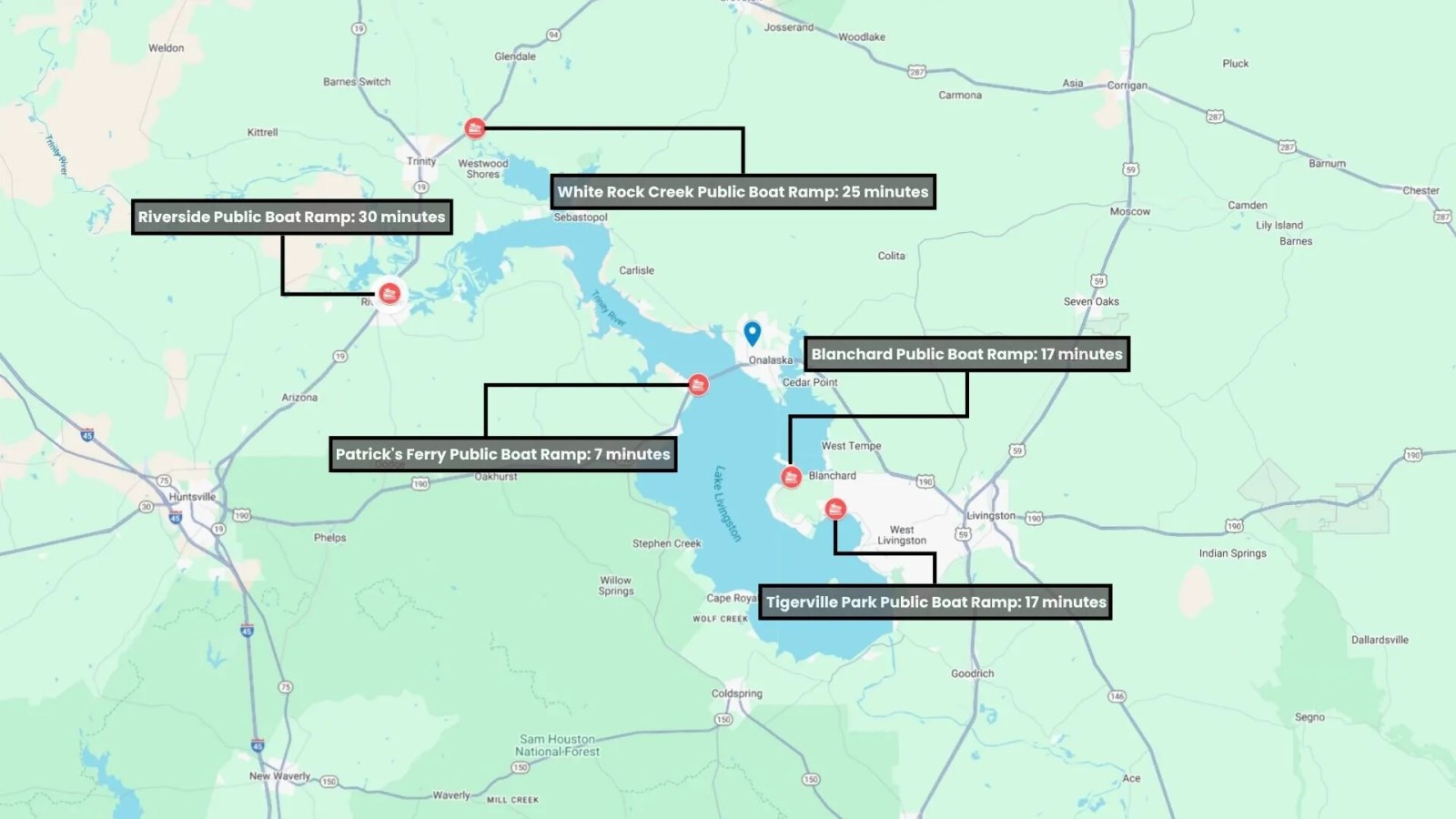 Community amenities: clubhouse, swimming pools, public parks, boat ramp to Lake Livingston