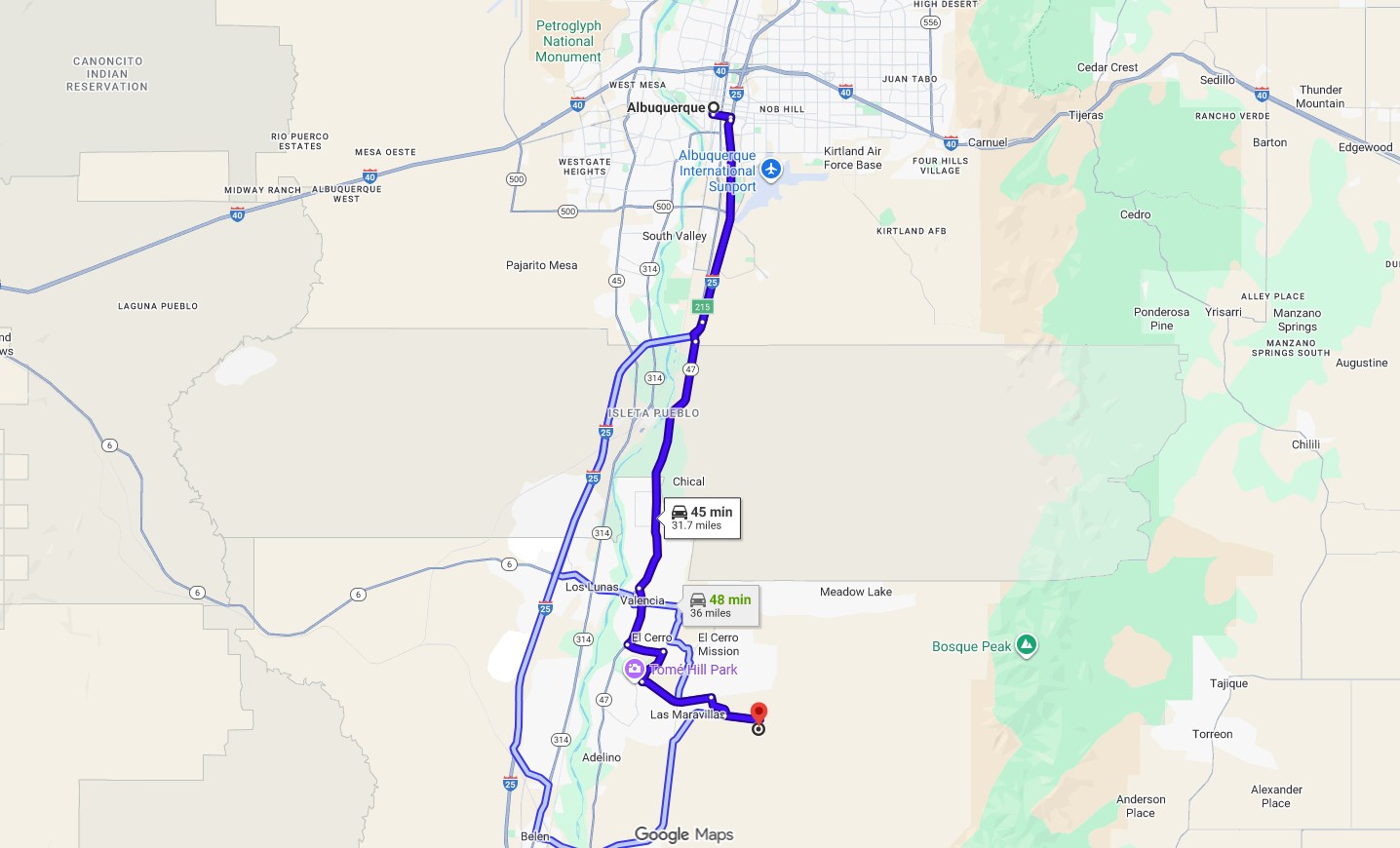 Follow I-25 S and NM-47 S to NM-263 W/S El Cerro Loop/El Cerro Lp in El Cerro
