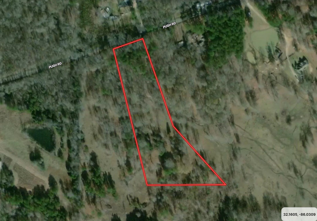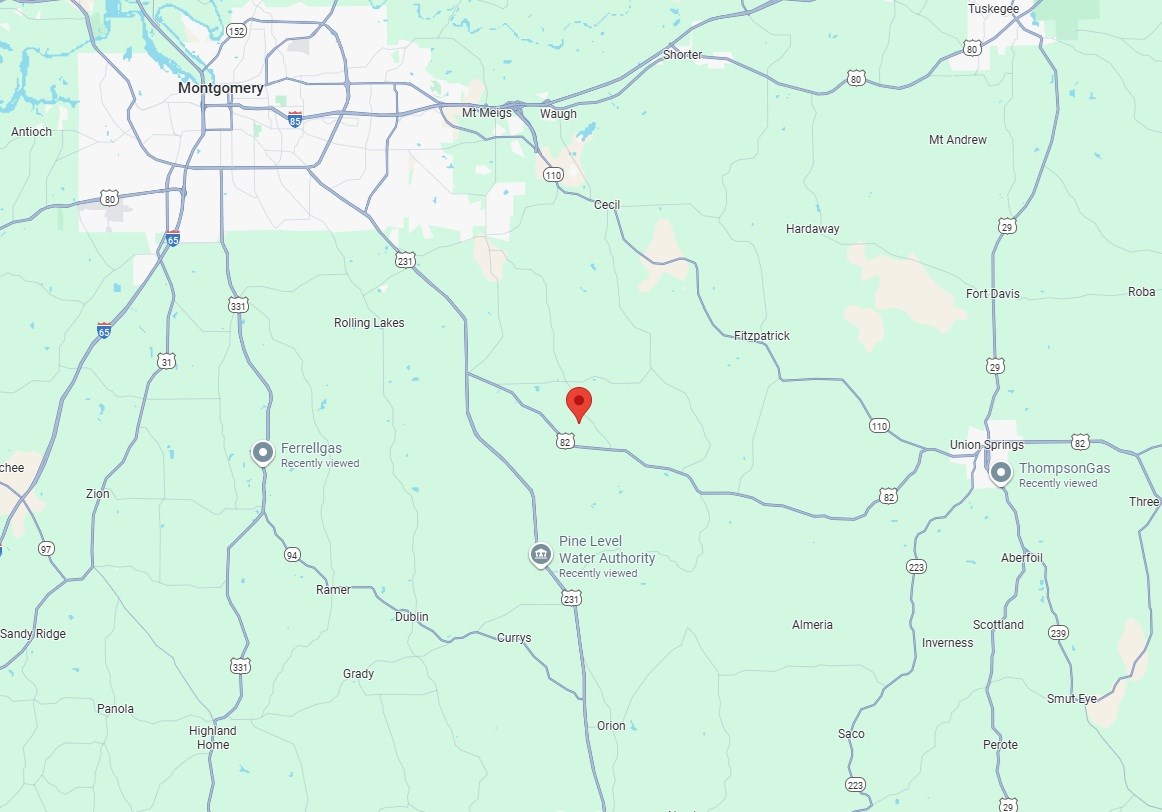 Take 85E out of Montgomery, Take Exit 9 and merge onto 271S/Taylor Rd toward US-231. Follow 82E to Carter Rd/Hayneville Ridge Rd (US-231). Stay on 231 / 82E until you get to Old Pike Rd. Take a right at Old Pike, go 1.8 miles, and take a right on Pugh Rd. Property road will be on your left in 0.4 miles.
