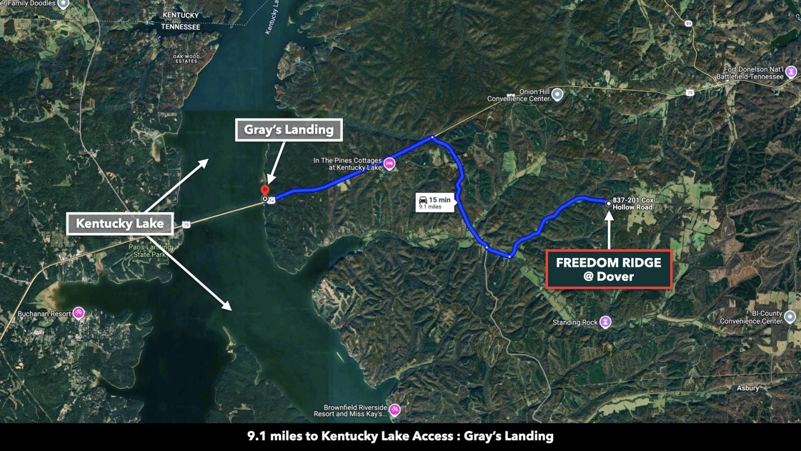 Freedom Ridge Dover is ideally situated between Kentucky Lake and Lake Barkley, while also being less than 3 miles from the South boundary of the 170,000 Acre Land Between the Lakes National Recreation Area.