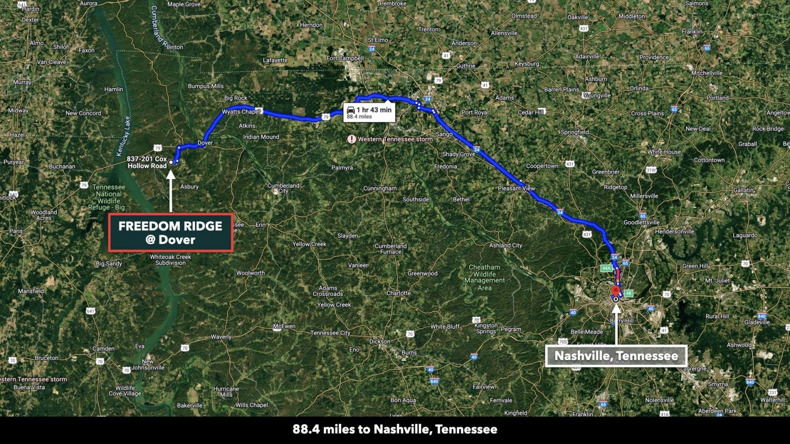 FREEDOM Ridge Dover is 7.9 miles from the South Welcome Station at Land Between the Lakes National Recreation Area, with many trailheads throughout Dover. Book a guide or plan your adventure. Learn more about Tennessee's best outdoor recreational gems here.