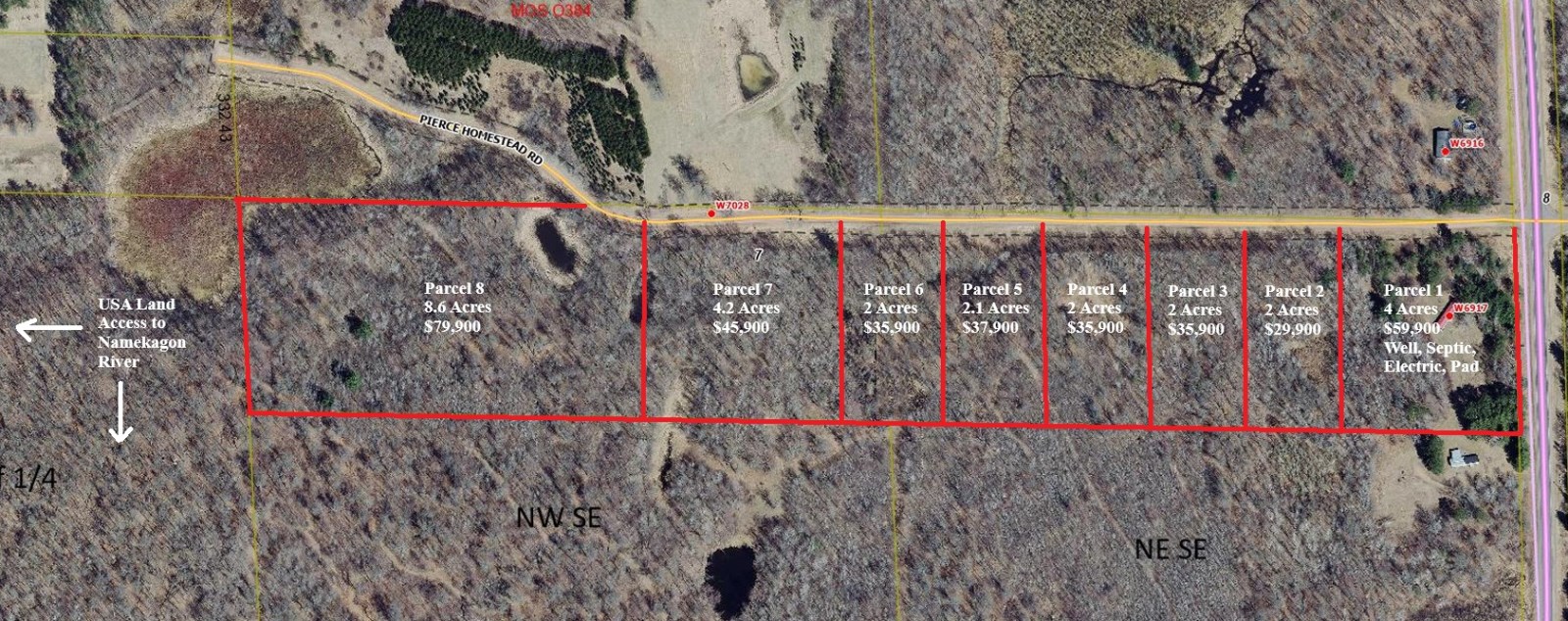If you enjoy the lakes and rivers, the Namekagon River and Trego Lake (451 acres) are just down the road. Island Lake (276 acres) and Dunn Lake (193 acres) are easily accessible and just short drives from this stunning NW Wisconsin acreage. These are all great lakes for boating, fishing and swimming. The branches of the Namekagon River, well known for trout fishing, are also within a short distance from this prime acreage.