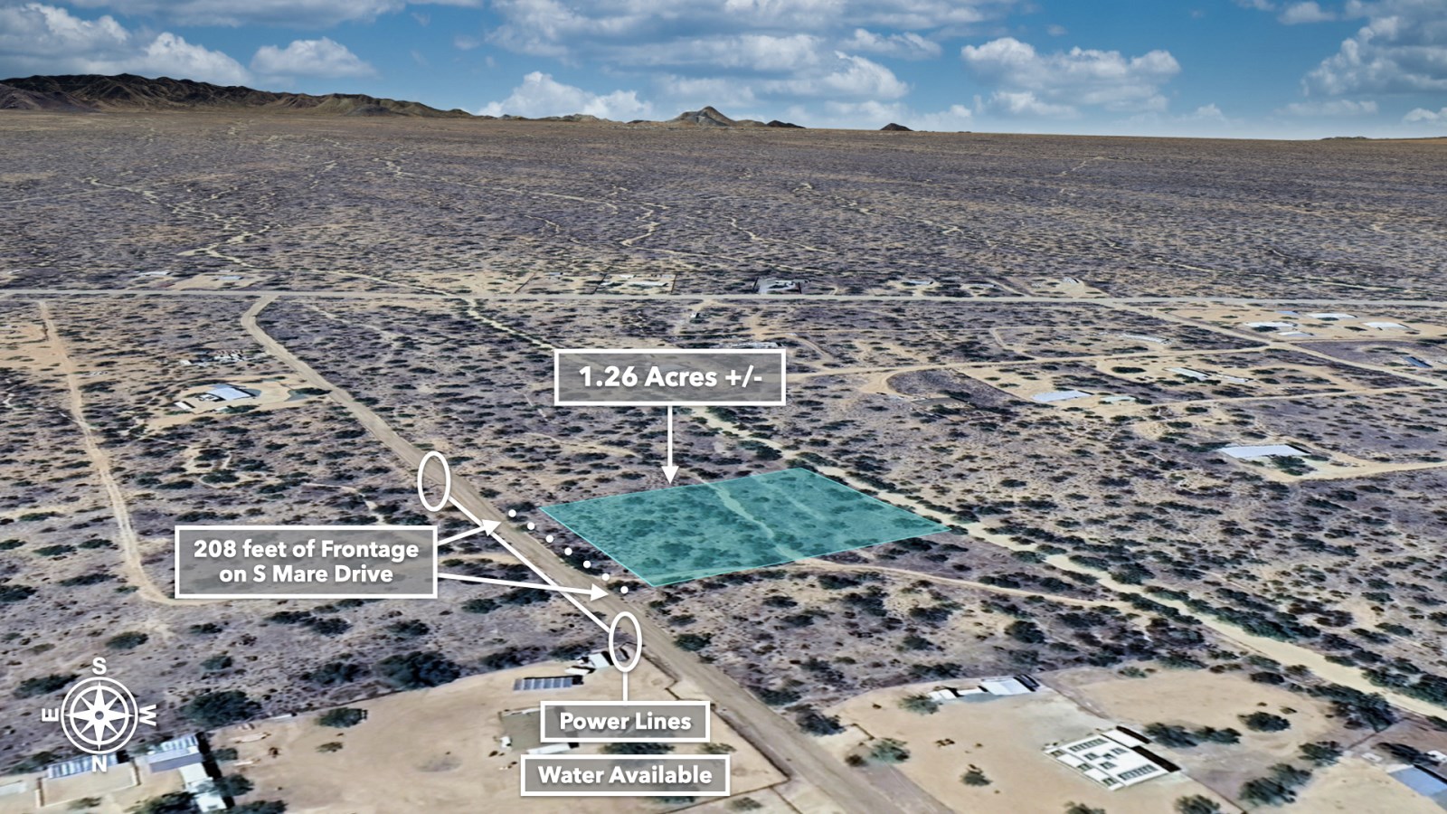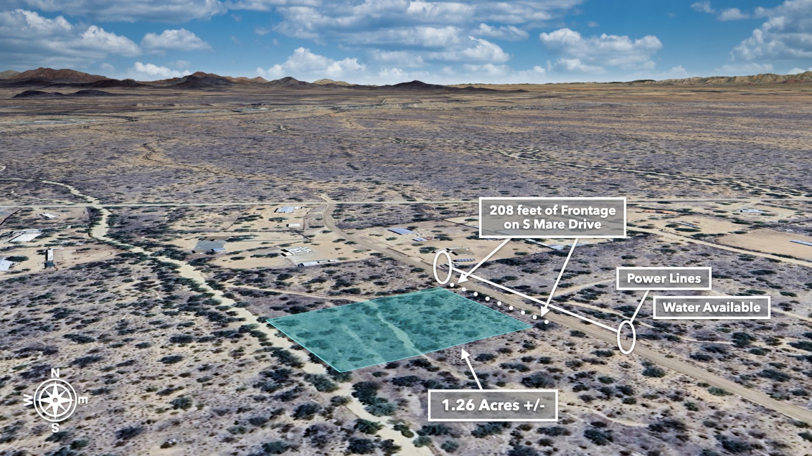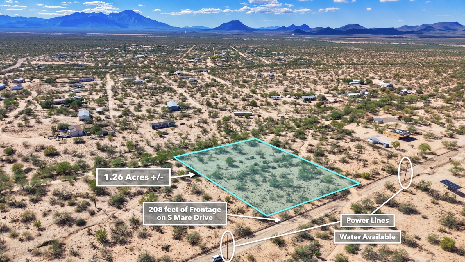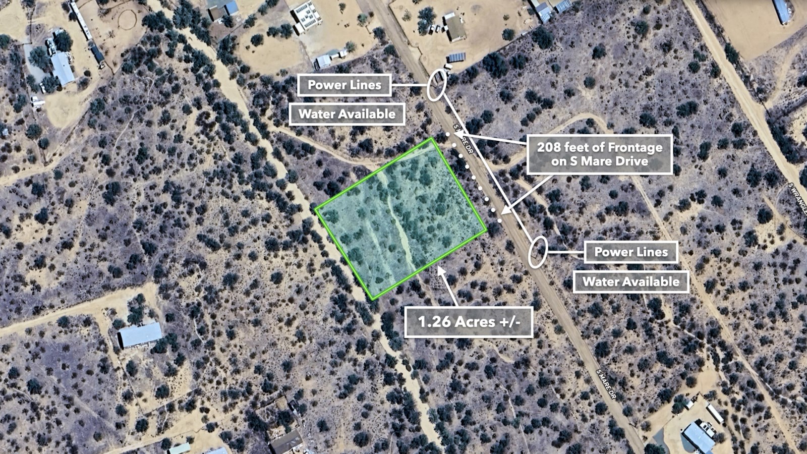 With 208 feet of Road Frontage and Power available along Mare Drive, practical considerations are already in place. Private Water Service is Available with Water Lines running near the Property. The Property's Southwest boundary even features natural drainage, essential during those refreshing desert rains.