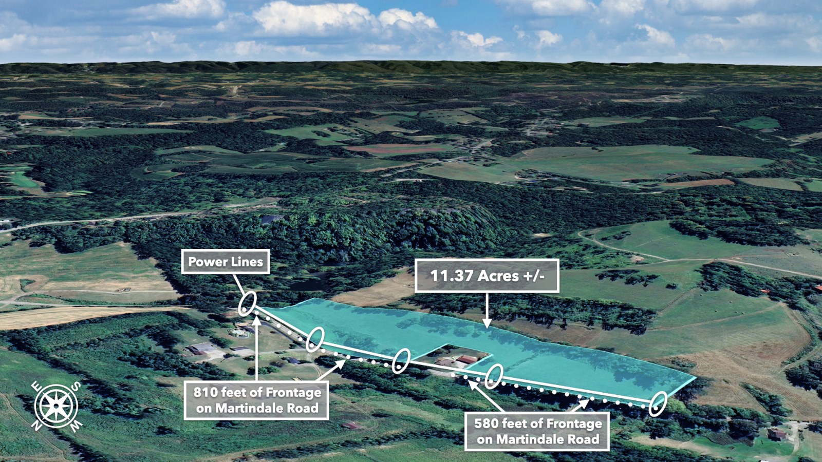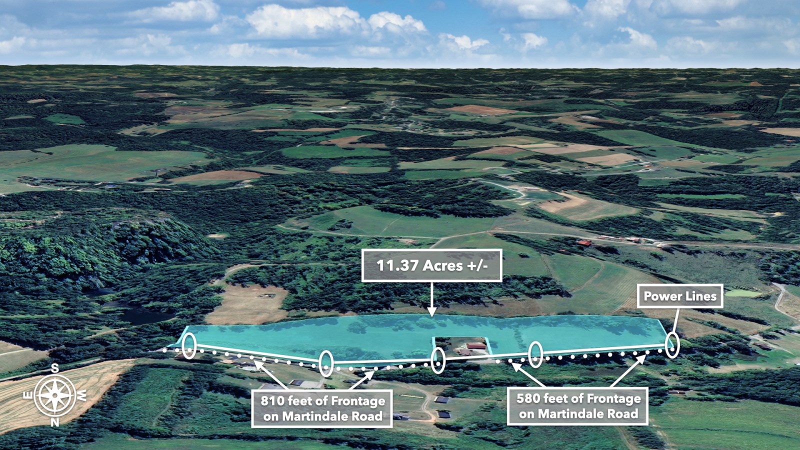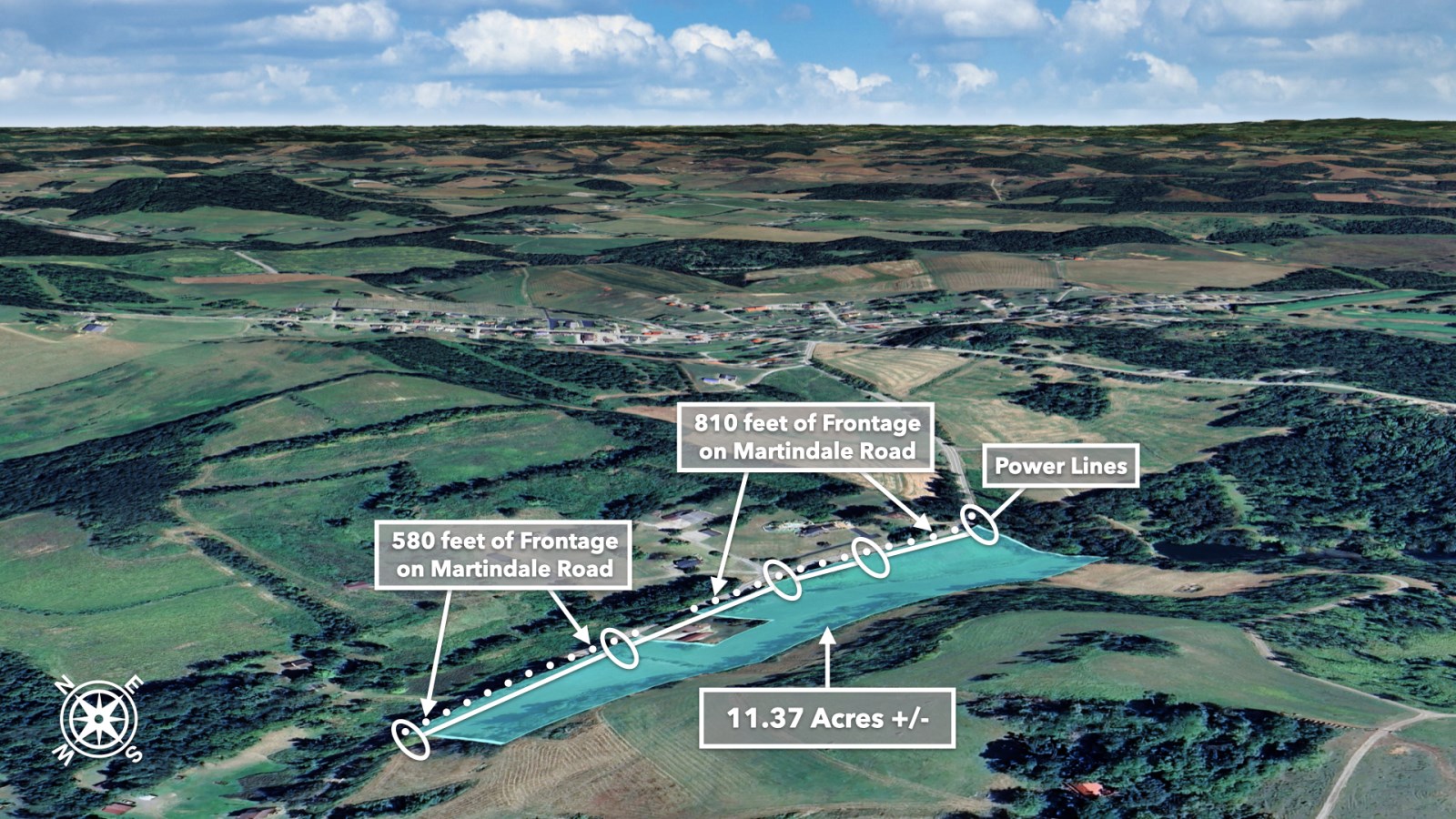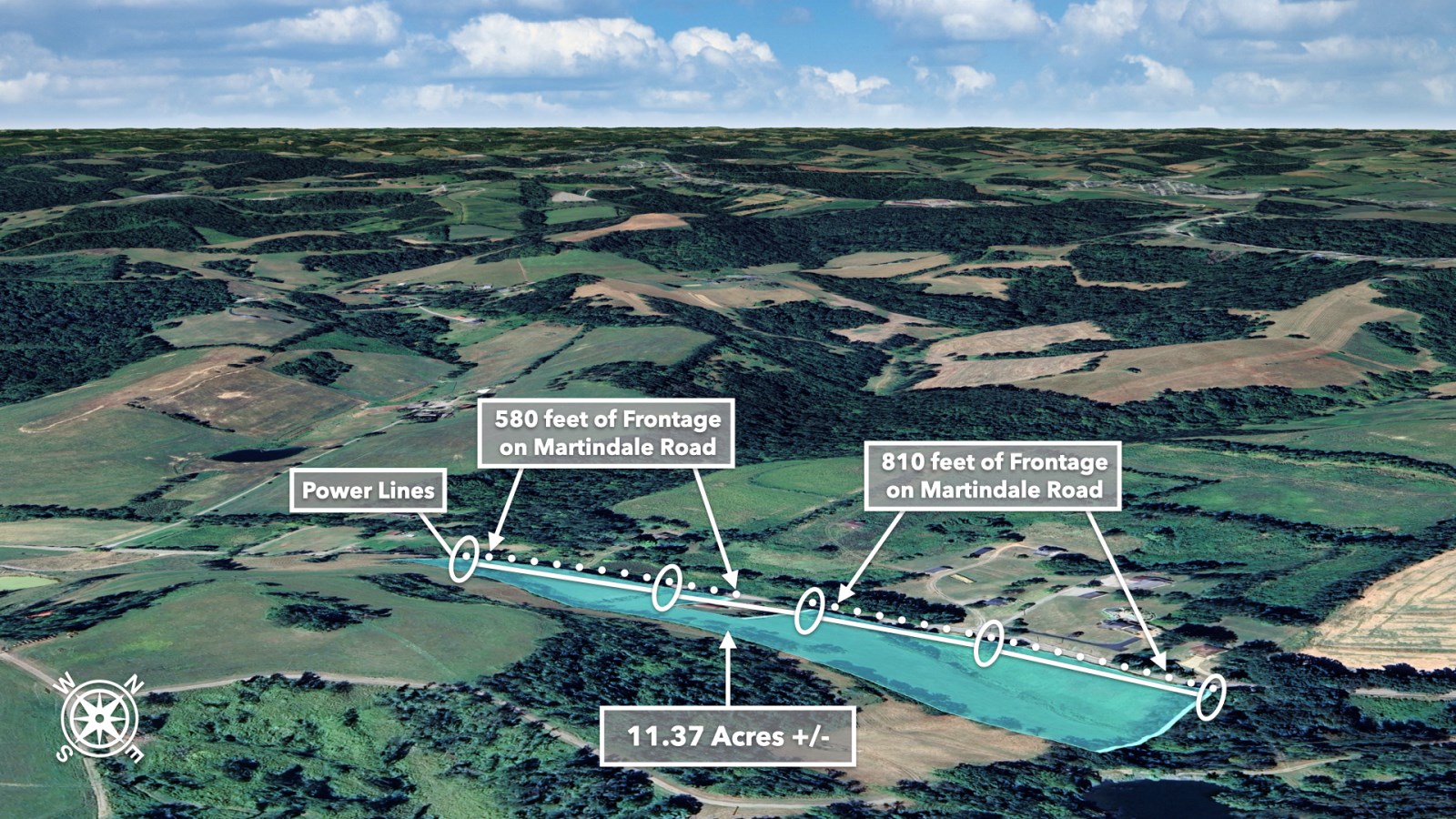 The land rolls along Martindale Road with an impressive 1,390 feet of total road frontage along the northern boundary-approximately 580 feet on the western portion and 810 feet on the eastern portion.