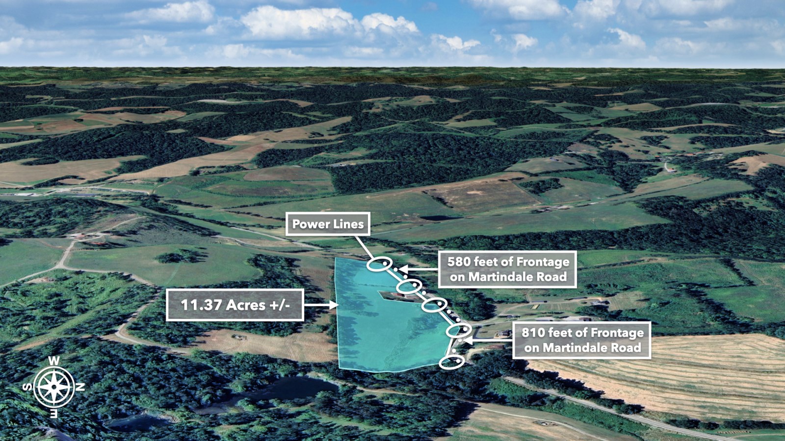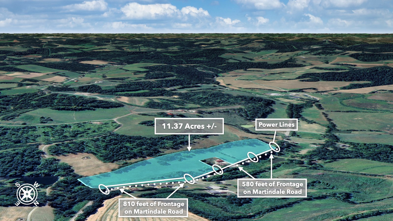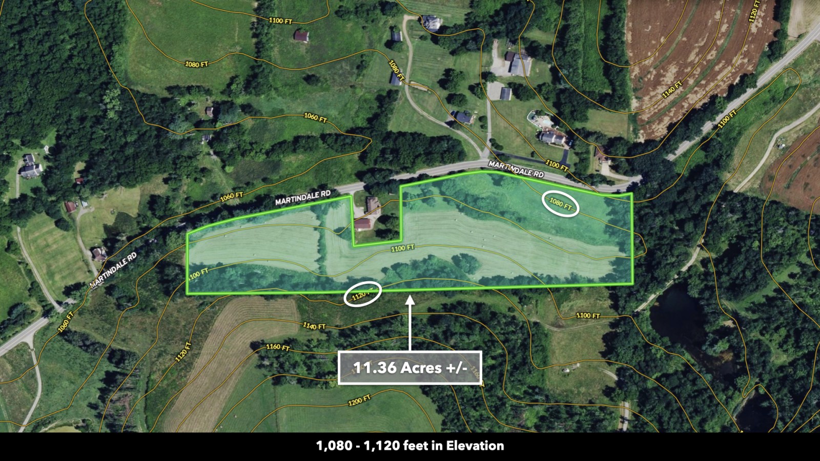The land rolls along Martindale Road with an impressive 1,390 feet of total road frontage along the northern boundary-approximately 580 feet on the western portion and 810 feet on the eastern portion.