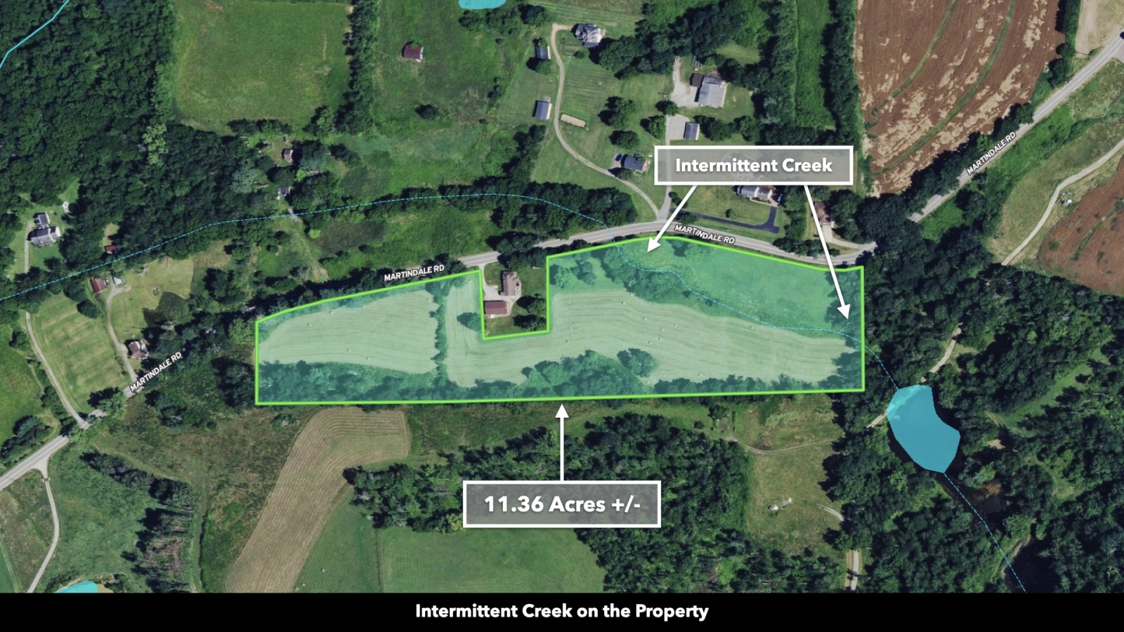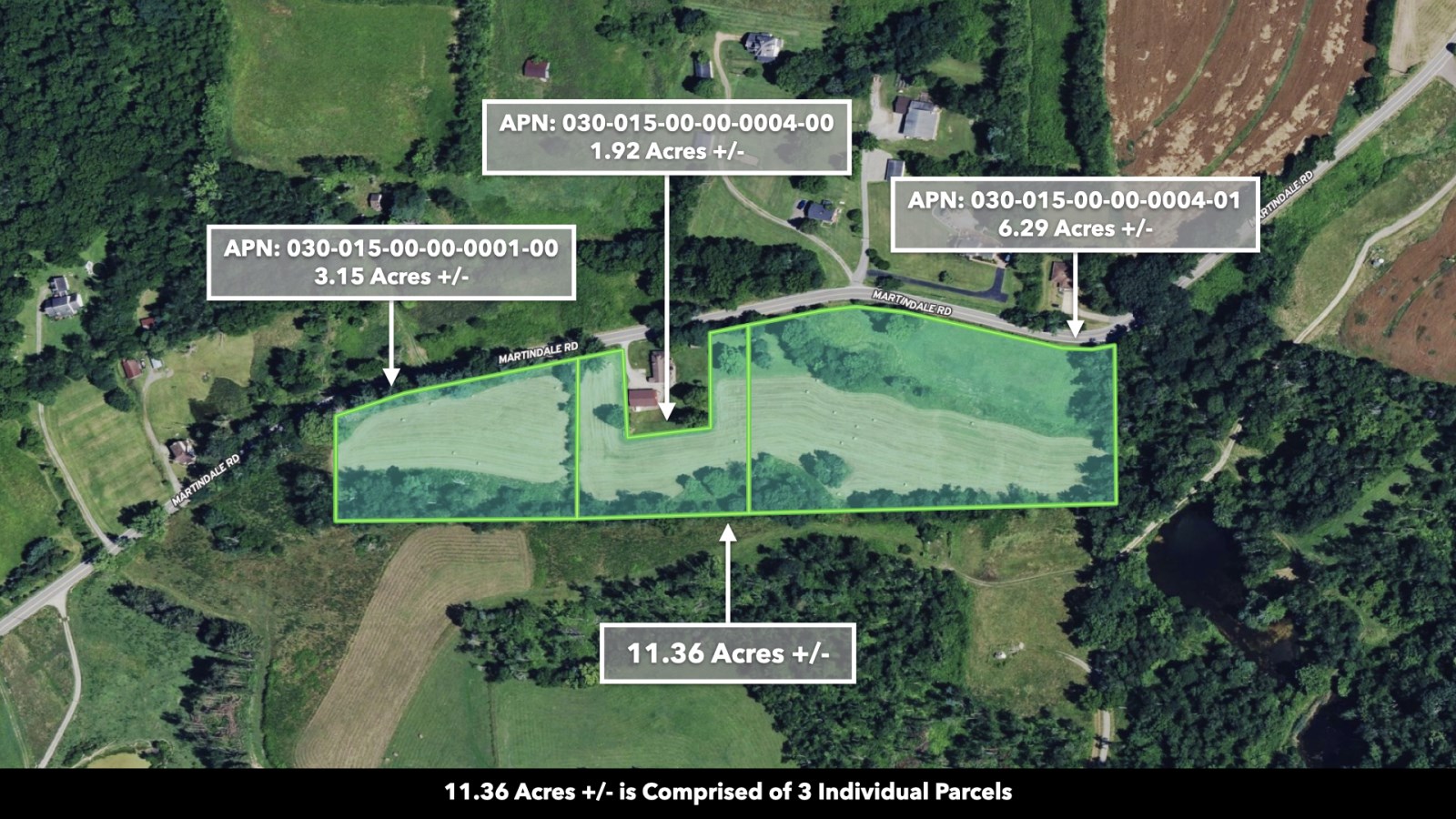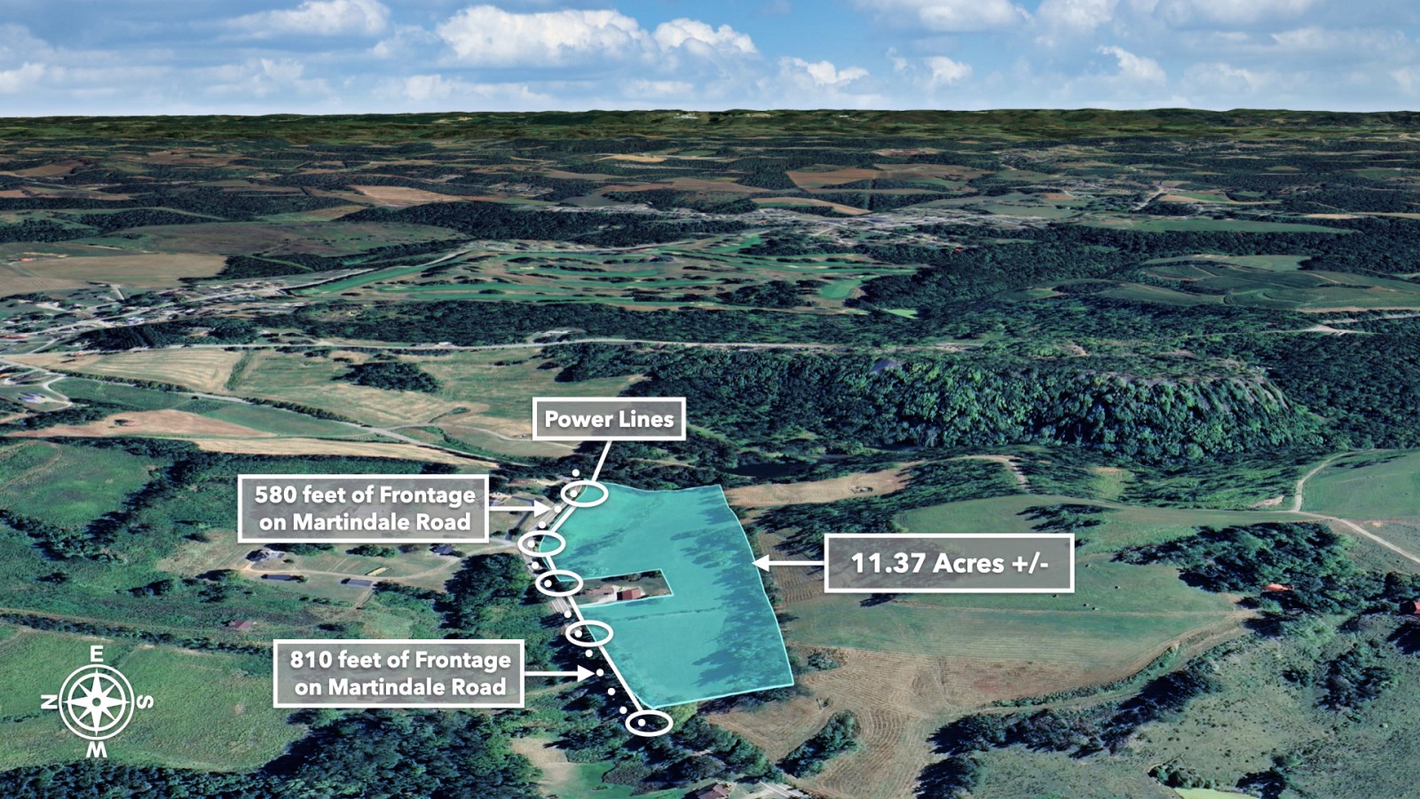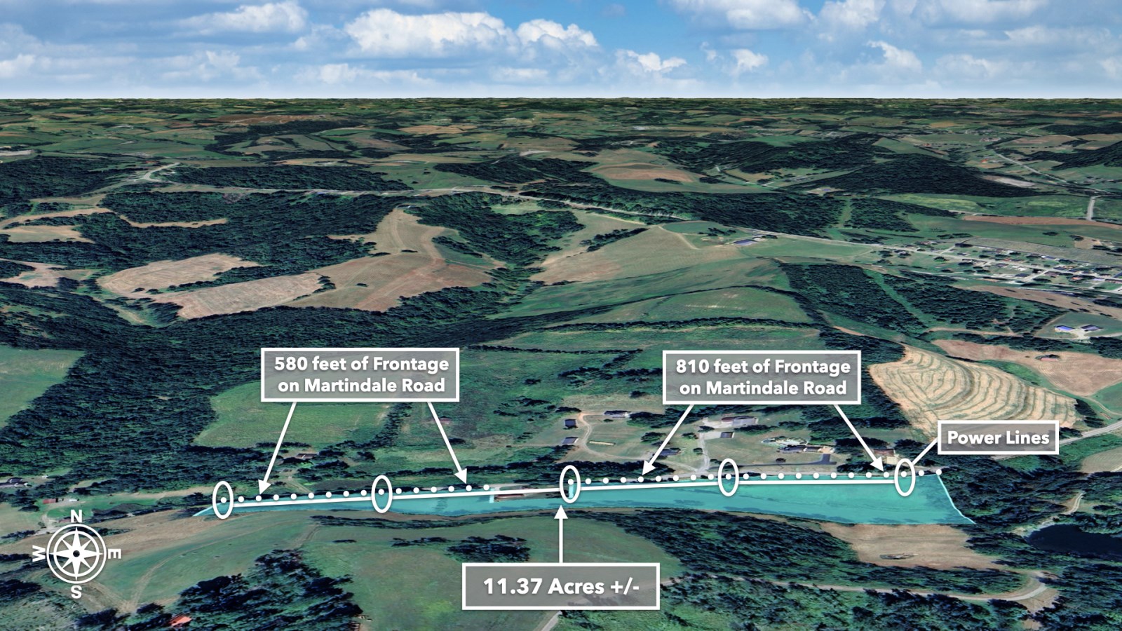 The land rolls along Martindale Road with an impressive 1,390 feet of total road frontage along the northern boundary-approximately 580 feet on the western portion and 810 feet on the eastern portion.
